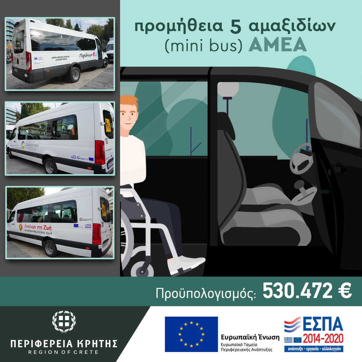 Πέντε καινούργια αμαξίδια ΑΜΕΑ (mini bus) για την μεταφορά των ωφελούμενων στους συλλόγους «ΖΩΟΔΟΧΟΣ ΠΗΓΗ» , «Δικαίωμα στη Ζωή» και «ΜΕΓΑΛΟΧΑΡΗ» που λειτουργούν αντίστοιχα 3 Κέντρα Ημερήσιας Φροντίδας Ατόμων με Αναπηρία (ΚΔΗΦ-ΑΜΕΑ) παρέδωσε σήμερα ο Περιφερειάρχης Κρήτης Σταύρος Αρναουτάκης.
