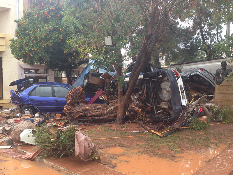 Η ισχυρή βροχόπτωση που ξέσπασε μετά τις 3:30 τα ξημερώματα έχει προκαλέσει πολύ σοβαρά προβλήματα με πλημμυρισμένα σπίτια, κατεστραμμένα αυτοκίνητα, δρόμους-ποτάμια και αρκετούς εγκλωβισμένους καθώς τα ορμητικά νερά έφτασαν σε ορισμένα σημεία το 1,5 μέτρο ύψος.