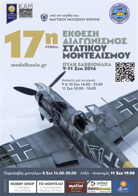 Ο Όμιλος Στατικού Μοντελισμού Χανίων σε συνεργασία με το Δήμο Χανίων και την ΚΕΠΠΕΔΗΧ-ΚΑΜ διοργανώνει την 17η Ετήσια Έκθεση-Διαγωνισμό Στατικού Μοντελισμού. Η Έκθεση η οποία τελεί υπό την αιγίδα του Ναυτικού Μουσείου Κρήτης, θα διεξαχθεί για μια ακόμη χρονιά στο φιλόξενο χώρο της Πύλης «Sabbionara» τις ημερομηνίες Πέμπτη 08/09/2016 έως Κυριακή 11/09/2016. Η Έκθεση θα είναι ανοικτή για το κοινό από Πέμπτη έως Σάββατο 14:00-21:00 και Κυριακή 10:00-18:00.