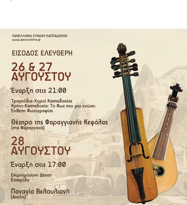 42 πολιτιστικοί σύλλογοι από όλη την Ελλάδα, εκθέσεις φωτογραφίας, θεατρικές και μουσικοχορευτικές παραστάσεις από την Καππαδοκία και την Κρήτη υπό τη συνοδεία των πιο καταξιωμένων καλλιτεχνών στο είδος τους, υπόσχονται τρεις μοναδικές ημέρες με μουσική, γλέντι, και ψυχαγωγία.