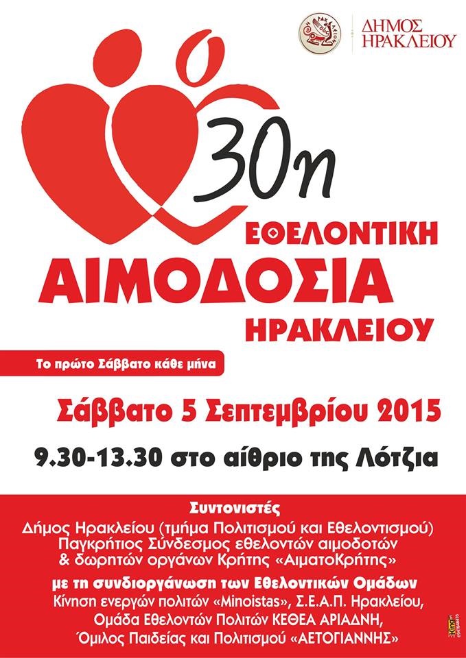 Εθελοντική Αιμοδοσία που θα πραγματοποιηθεί το Σάββατο 5 Σεπτεμβρίου, στο κέντρο της πόλης του Ηρακλείου, (στο Αίθριο της Λότζια) και ώρες 09:30 – 13:30. Πρόκειται για μια κοινή προσπάθεια αιμοδοσίας εθελοντικών σωματείων και οργανώσεων του Ηρακλείου, την οποία συντονίζουν: