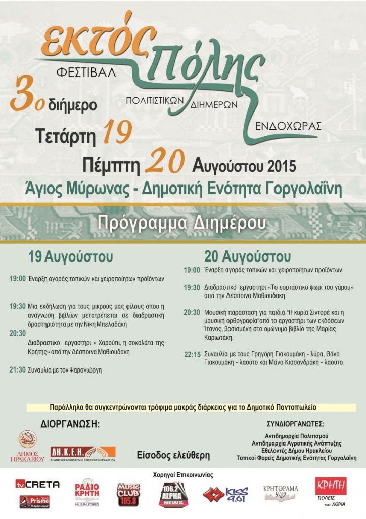 Το 3ο – και τελευταίο για φέτος το καλοκαίρι – Διήμερο Φεστιβάλ Προβολής και Προώθησης Τοπικών Προϊόντων που διοργανώνει η Κοινωφελής Δημοτική Επιχείρηση Πολιτισμού, Περιβάλλοντος, Κοινωνικής Πρόνοιας του Δήμου Ηρακλείου θα πραγματοποιηθεί στον Άγιο Μύρωνα (Δημοτική Κοινότητα Γοργολαΐνη).