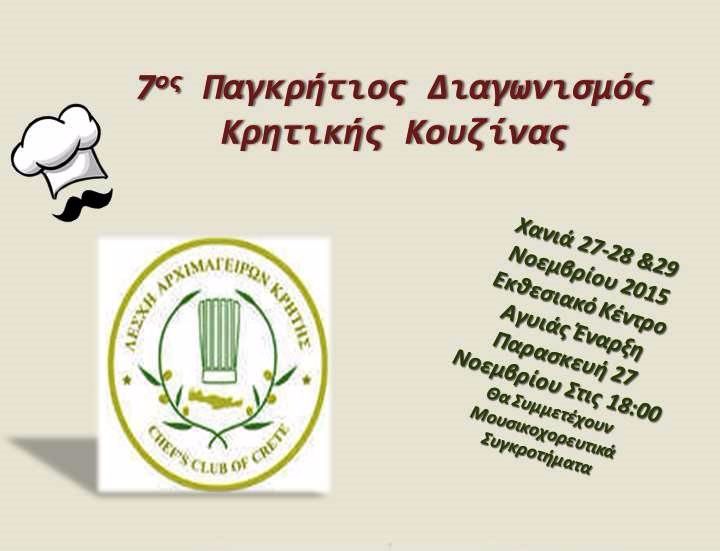 Με μεγάλη χαρά σας ενημερώνουμε ότι για ακόμα μια χρονιά η λέσχη Αρχιμαγείρων Κρήτης θα πραγματοποιήσει ο 7ος Παγκρήτιος Διαγωνισμός Κρητικής Κουζίνας στα Χανιά στον εκθεσιακό χώρο Αγυιάς στις 27,28&29 Νοεμβρίου 2015 με τη στήριξη της Περιφέρειας Κρήτης και του Ο.Α.Δ.Υ.Κ. και την συνδιοργάνωση της Περιφερειακής Ενότητας Χανιών.