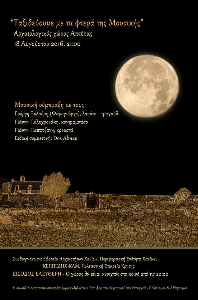Φέτος στην αυγουστιάτικη πανσέληνο στις 18 Αυγούστου 2016 στις 21:00 «Ταξιδεύουμε με τα φτερά της Μουσικής» στον Αρχαιολογικό Χώρο Απτέρας μέσα από μια μουσική διαδρομή στη Μεσόγειο, με αφετηρία την Κρήτη.