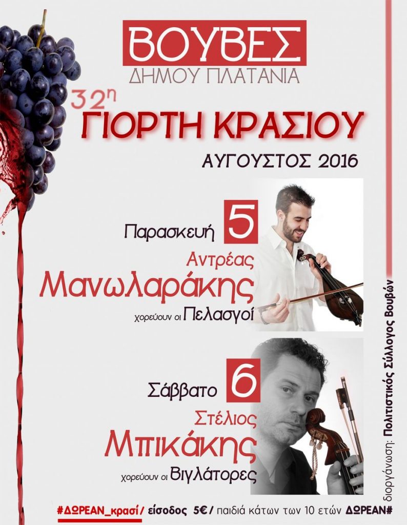 Ο Πολιτιστικός Σύλλογος Βουβών διοργανώνει και φέτος για 32η συνεχή χρονιά τη Γιορτή Κρασιού, στις 5 και 6 Αυγούστου, στον αύλειο χώρο του Δημοτικού Σχολείου Βουβών. Πρόκειται για μια θεματική εκδήλωση, η οποία είναι αφιερωμένη στη μακραίωνη παράδοση του χωριού στην αμπελουργία και στο φημισμένο για την άριστη ποιότητά του βουβιανό κρασί, το οποίο προσφέρεται δωρεάν στους χιλιάδες επισκέπτες που τιμούν τη γιορτή κάθε χρόνο με την παρουσία τους. Στη φετινή εκδήλωση θα μας διασκεδάσουν την Παρασκευή 5 Αυγούστου το κρητικό συγκρότημα του Ανδρέα Μανωλαράκη και το Σάββατο 6 Αυγούστου το κρητικό συγκρότημα του Στέλιου Μπικάκη. Παραδοσιακούς χορούς θα παρουσιάσουν οι χορευτικοί σύλλογοι «Πελασγοί» και «Βιγλάτορες» αντίστοιχα.