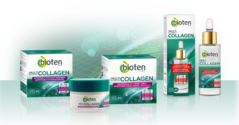 Το νέο, αντιρυτιδικό σύστημα περιποίησης bioten ΜULTICOLLAGEN αποτελείται από τρία προϊόντα που υπόσχονται θεαματικά, κλινικά αποδεδειγμένα αποτελέσματα για την εξαφάνιση των ρυτίδων – ένα «φλέγον» θέμα που απασχολεί κάθε γυναίκα! κρέμα ημέρας, θεραπεία νύχτας και αντιρυτιδικός ορός.