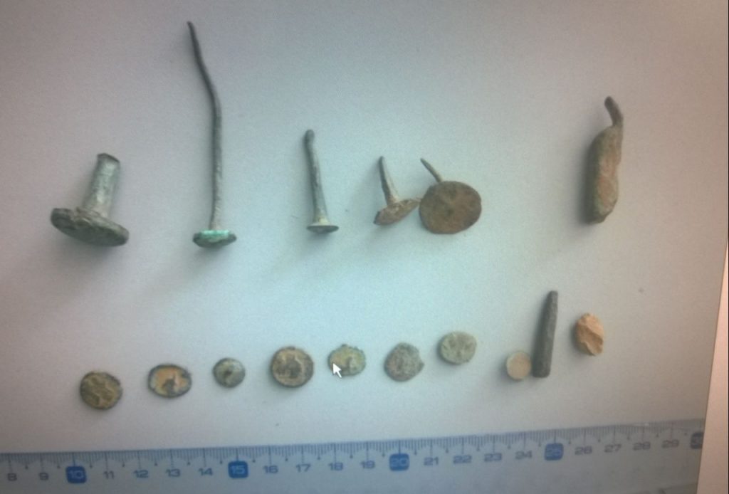 Στη συνέχεια πραγματοποιήθηκε έλεγχος από αστυνομικούς από το Αστυνομικό Τμήμα Κισσάμου , κατά τη διάρκεια του οποίου βρέθηκαν και κατασχέθηκαν 8 αρχαία μεταλλικά νομίσματα και διάφορα και  διάφορα άλλα  μεταλλικά αντικείμενα  τα οποία εμπίπτουν στη Νομοθεσία « Περί προστασίας Αρχαιοτήτων», μια  συσκευή ανίχνευσης  μετάλλων και δυο σκαπάνες με ξύλινο κοντάρι.
