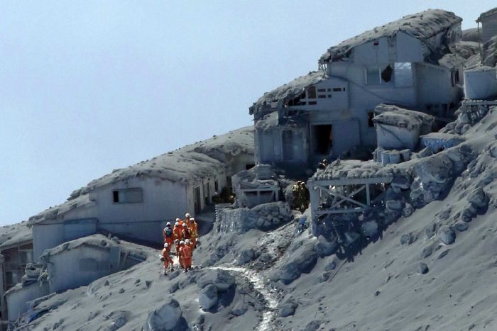 Νωρίς το πρωί, οι ιαπωνικές δυνάμεις αυτοάμυνας προσγείωσαν δύο ελικόπτερά τους στο βουνό, η επιφάνεια του οποίου καλύπτεται από παχύ στρώμα γκρίζας στάχτης που θυμίζουν σεληνιακό τοπίο. Δύναμη 1.000 εθελοντών μετέχει στις επιχειρήσεις.