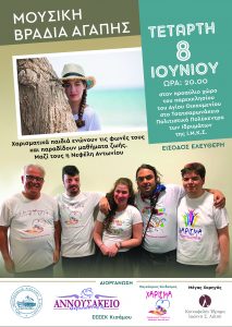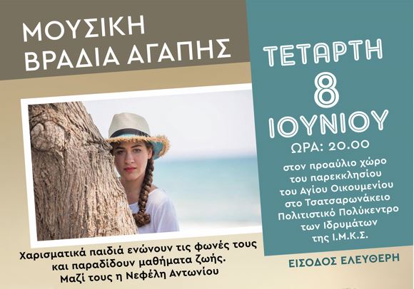 Το Αννουσάκειο Θεραπευτήριο Χρονίων Παθήσεων, Κέντρο Αποθεραπείας -Αποκατάστασης Κλειστής Νοσηλείας «Ο Άγιος Σπυρίδων» της Ιεράς Μητρόπολης  Κισάμου και Σελίνου, ο Παγκύπριος Σύνδεσμος «Χάρισμα», με την Νεφέλη Αντωνίου και το ΕΕΕΕΚ Κισάμου διοργανώνουν μουσική βραδιά αγάπης την Τετάρτη 8 Ιουνίου 2022, 8:00 μ.μ., στο προαύλιο χώρο του παρεκκλησίου του Αγίου Οικουμενίου, στο Τσατσαρωνάκειο Πολιτιστικό Πολύκεντρο, των ιδρυμάτων της Ιεράς Μητρόπολης Κισάμου και Σελίνου.