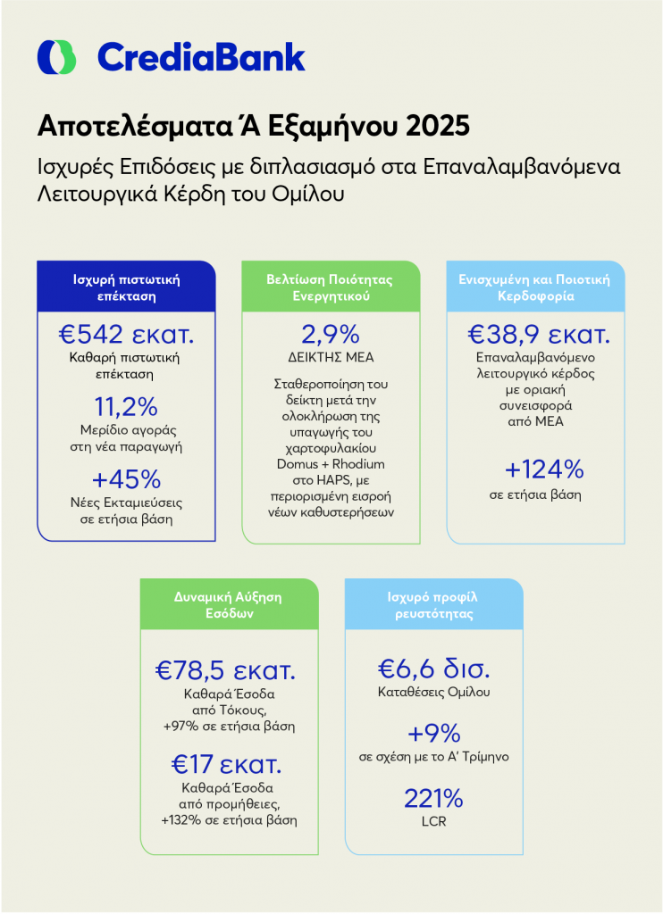 CrediaBank: Ισχυρές επιδόσεις και στο Α’ εξάμηνο 2025, με διπλασιασμό στα Επαναλαμβανόμενα Λειτουργικά Κέρδη του Ομίλου