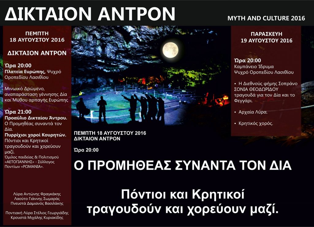 Για δεύτερη συνεχή χρονιά συνεχίζεται ο θεσμός των διήμερων εκδηλώσεων στο σπήλαιο γέννησης του Δία το Δικταίον Άντρον που συνδιοργανώνουν ο Δήμος Οροπεδίου Λασιθίου, η Εφορεία Αρχαιοτήτων Λασιθίου, το «Καμπάνειο Ίδρυμα» και το ΚΕΑΝ.