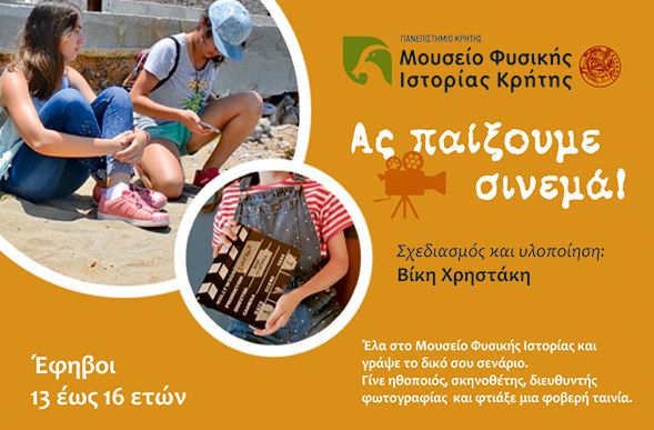 Τα εργαστήρια κινηματογράφου «Ας παίξουμε σινεμά» καλούν τους εφήβους, 11 έως 16 ετών, να ανακαλύψουν τα εργαλεία, τα επαγγέλματα και την αφήγηση της 7ης τέχνης. Μέσα από δημιουργικές και συλλογικές διαδικασίες γνωρίζουν τα τέσσερα θεμελιώδη στάδια δημιουργίας μιας κινηματογραφικής ταινίας: το σενάριο, την παραγωγή, τη σκηνοθεσία και το μοντάζ. Παρακολουθούν αποσπάσματα από κλασικές κινηματογραφικές παραγωγές και συνεργάζονται για να φτιάξουν μια ταινία μικρού μήκους παίρνοντας αφορμή από τα εκθέματα και τους επιστήμονες του Μουσείου Φυσικής Ιστορίας Κρήτης! Τα εργαστήρια ολοκληρώνονται με την προβολή των ταινιών μικρού μήκους που έφτιαξαν οι συμμετέχοντες κατά τη διάρκεια των 10 συναντήσεων στο ΜΦΙΚ.