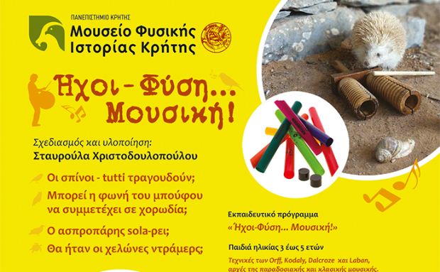 Το εκπαιδευτικό πρόγραμμα «Ηχοι-Φύση..Μουσική!» απευθύνεται σε παιδιά ηλικίας 3 έως 5 ετών τα οποία, μέσα από το παιχνίδι, συναντούν τον ρυθμό μέσα στον λόγο, το τραγούδι και τον χορό και κινούνται στον χώρο του μουσείου με μέσο τη μουσική. Χρησιμοποιώντας μουσικά όργανα, όπως ταμπουρίνα, μαράκες, καστανιέτες, εμπνέονται από προϊστορικά και σύγχρονα ζώα ανακαλύπτουν μέσα από τον αρμονικό κόσμο της φύσης τον κόσμο της μουσικής. Το πρόγραμμα βασίζεται στις θεωρίες των δασκάλων του μουσικού παιχνιδιού, τεχνικές των Orff, Kodaly και Dalcroze , σε συνδυασμό με τη διδασκαλία των αρχών της παραδοσιακής και της κλασικής μουσικής.