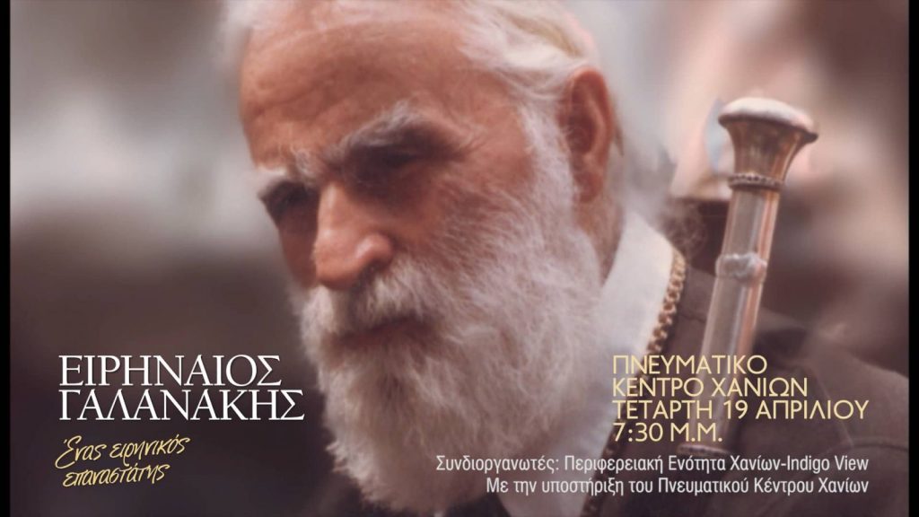 «Ειρηναίος Γαλανάκης, ένας ειρηνικός επαναστάτης» είναι ο τίτλος της ταινίας-ντοκιμαντέρ των Γιώργου Κουκουράκη και Θοδωρή Παπαδουλάκη, που θα προβληθεί την Τετάρτη 19 Απριλίου στις 7:30 μ.μ. στο Πνευματικό Κέντρο Χανίων με είσοδο ελεύθερη για το κοινό. Προλογίζει η Λένα Διβάνη, συγγραφέας, καθηγήτρια Ιστορίας στη Νομική Σχολή του Πανεπιστημίου Αθηνών. Την εκδήλωση συνδιοργανώνουν η Περιφερειακή Ενότητα Χανίων και η Indigo View με την υποστήριξη του Πνευματικού Κέντρου Χανίων.