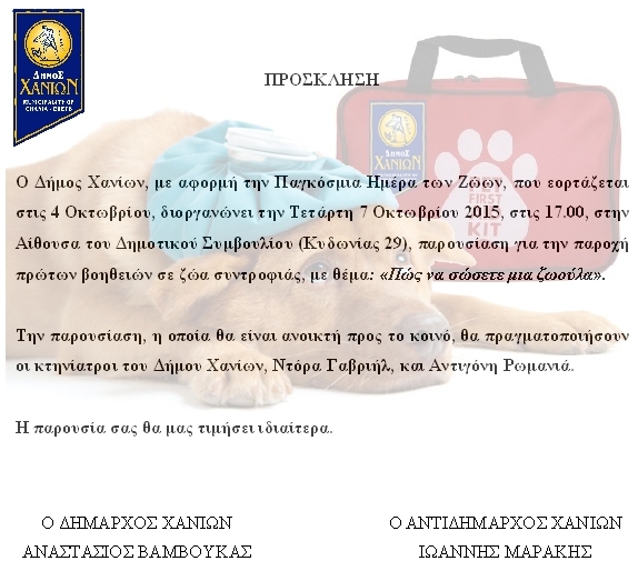 Ενημερωτική εκδήλωση ? παρουσίαση για την παροχή πρώτων βοηθειών σε ζώα συντροφιάς, με θέμα: «Πώς να σώσετε μια ζωούλα» διοργανώνει ο Δήμος Χανίων, με αφορμή την Παγκόσμια Ημέρα των Ζώων, που εορτάζεται στις 4 Οκτωβρίου.