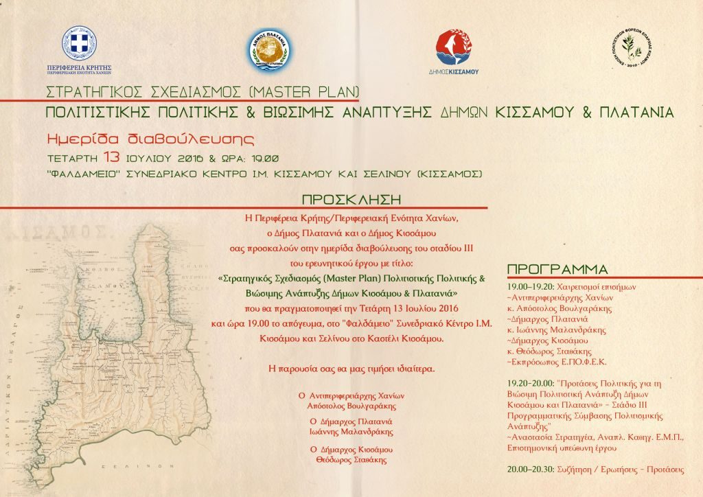 Στο πλαίσιο του πρότυπου ερευνητικού προγράμματος με τίτλο «Στρατηγικός Σχεδιασμός (Master Plan) Πολιτιστικής Πολιτικής & Βιώσιμης Ανάπτυξης Δήμων Πλατανιά και Κισσάμου» – το οποίο χρηματοδοτείται από ίδιους πόρους των δύο ανωτέρω Δήμων καθώς και της Περιφέρειας Κρήτης – θα πραγματοποιηθεί την Τετάρτη 13 Ιουλίου 2016 και ώρα 19.00 το απόγευμα στο «Φαλδάμειο» Συνεδριακό Κέντρο της Ι.Μ. Κισσάμου και Σελίνου (στην Κίσσαμο) – ενημερωτική εκδήλωση για την παρουσίαση των αποτελεσμάτων και των προτάσεων του τρίτου και τελικού σταδίου της μελέτης για την πολιτιστική ανάπτυξη των δύο ανωτέρω Δήμων.