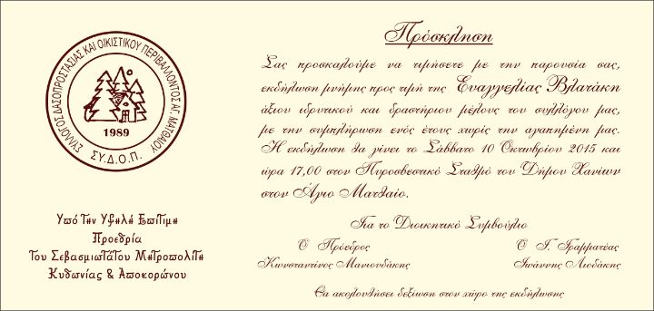 Εκδήλωση μνήμης προς τιμή της Ευαγγελίας Βλατάκη, ιδρυτικού και δραστήριου μέλους του Συλλόγου Δασοπροστασίας και Οικιστικού Περιβάλλοντος Αγίου Ματθαίου, διοργανώνει ο εν λόγω Σύλλογος σε συνεργασία με τον Δήμο Χανίων το Σάββατο 10 Οκτωβρίου 2015, στις 17.00, στον Πυροσβεστικό Σταθμό του Δήμου Χανίων, στον Άγιο Ματθαίο.