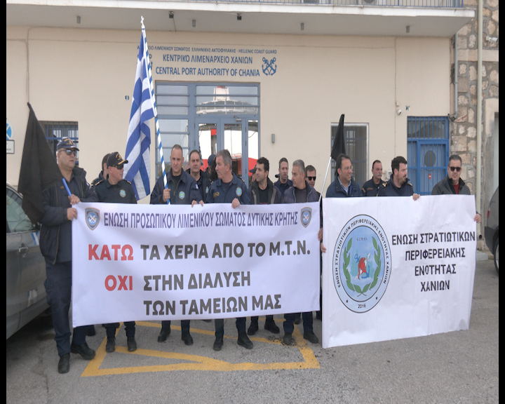Αντίθετοι στο πολυνομοσχέδιο του Υπουργείου Εθνικής Άμυνας, που μεταξύ άλλων καταργεί τη διαχείριση των Μετοχικών ταμείων των ένστολων από τα διοικητικά τους συμβούλια και τη μεταφέρει στο Υπουργείο, είναι οι λιμενικοί αλλά και οι ένστολοι του στρατού. Σήμερα στις 12 το μεσημέρι τα μέλη της ένωσης προσωπικού του λιμενικού σώματος Δυτικής Κρήτης προχώρησαν σε ένστολη διαμαρτυρία στην είσοδο του κεντρικού λιμεναρχείου Χανίων.