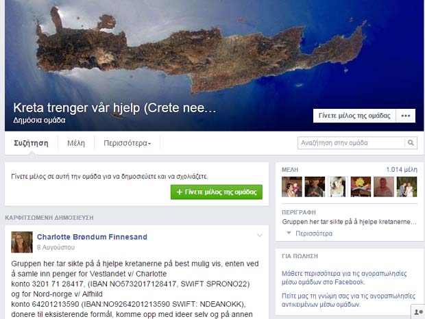 Στη σελίδα του facebook υπάρχουν και τραπεζικοί λογαριασμοί προκειμένου να συγκεντρώνονται χρήματα και να αγοράζουν διάφορα είδη για τον “σκληρά δοκιμαζόμενο λαό της Κρήτης”, όπως αναφέρεται.