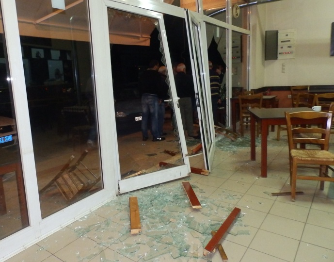 Στο μεταξύ, εκείνη την ώρα το κατάστημα ήταν γεμάτο και οι θαμώνες παρακολουθούσαν αγώνα ποδοσφαίρου στην τηλεόραση όταν ξαφνικά, πίσω από τις πλάτες τους άκουσαν τον κρότο της τζαμαρίας να σπάει. Ευτυχώς από τα γυαλιά που σκορπίστηκαν παντού δεν τραυματίστηκε κανείς, καθώς όλοι απομακρύνθηκαν έγκαιρα.
