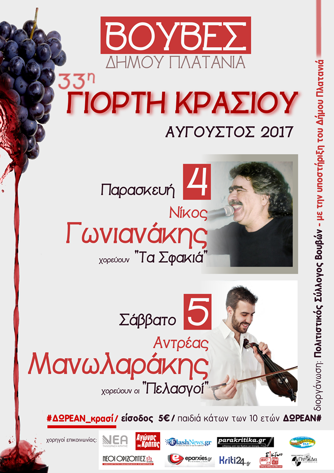 Ο Πολιτιστικός Σύλλογος Βουβών διοργανώνει και φέτος, με την υποστήριξη του Δήμου Πλατανιά, για 33η συνεχή χρονιά τη Γιορτή Κρασιού, στις 4 και 5 Αυγούστου, στον αύλειο χώρο του Δημοτικού Σχολείου Βουβών. Πρόκειται για μια θεματική εκδήλωση, η οποία είναι αφιερωμένη στη μακραίωνη παράδοση του χωριού στην αμπελουργία και στο φημισμένο για την άριστη ποιότητά του βουβιανό κρασί, το οποίο προσφέρεται δωρεάν στους χιλιάδες επισκέπτες που τιμούν τη γιορτή κάθε χρόνο με την παρουσία τους. Στη φετινή εκδήλωση θα μας διασκεδάσουν την Παρασκευή 4 Αυγούστου το κρητικό συγκρότημα του Νίκου Γωνιανάκη και το Σάββατο 5 Αυγούστου το κρητικό συγκρότημα του Ανδρέα Μανωλαράκη. Χορεύουν οι παραδοσιακοί σύλλογοι «Τα Σφακιά» και «Οι Πελασγοί» αντίστοιχα. Τιμή Εισόδου: 5 €. Παιδιά έως 10 χρονών δωρεάν.