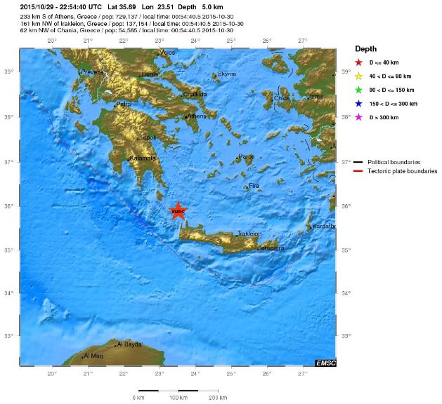 Σεισμική δόνηση μεγέθους 3,5 βαθμών της κλίμακας Ρίχτερ σημειώθηκε στις 12:54 μετά τα μεσάνυχτα, με επίκεντρο την θαλάσσια περιοχή, 62 χιλιόμετρα βορειοδυτικά των Χανίων και 45 χιλιόμετρα βορειοδυτικά από το Κολυμπάρι.