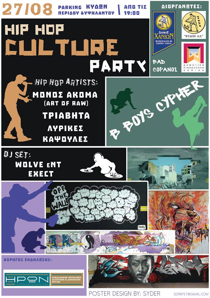 Ο Δήμος Χανίων, η ΚΥΔΩΝ Α.Ε., η Δημοτική Πινακοθήκη Χανίων και οι Bad Copanoi, διοργανώνουν το Hip Hop Culture Party το Σάββατο 27 Αυγούστου 2016 και ώρα 19:00, στο χώρο του Δημοτικού χώρου στάθμευσης “Κύδων”, στην συμβολή των οδών Περίδου και Υψηλάντων.