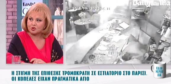 Κι εκεί που η ομάδα του “Καλημερούδια” παρακολουθούσε τα σοκαριστικά βίντεο από τις επιθέσεις στο Παρίσι, ήρθε μια αποκάλυψη από την Βίκυ Παγιατάκη που αναστάτωσε τους πάντες! «Το έχω ζήσει αυτό, μου έχουν βάλει όπλο εδώ…», εκμυστηρεύτηκε η αστρολόγος και αφηγήθηκε το περιστατικό: «Στη Συρία το 1982-83, ήταν ο Άσαντ και είχαν κάνει πραξικόπημα αλλά εγώ δεν το είχα πληροφορηθεί.