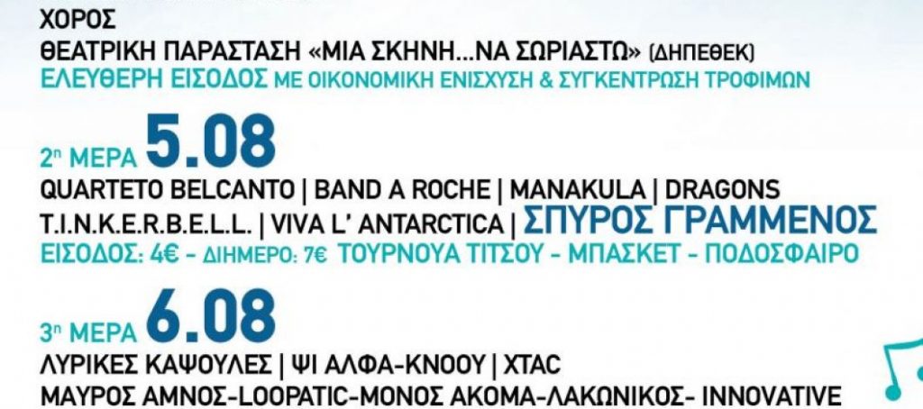 Το φεστιβάλ αρχίζει  την Πέμπτη 04/08 με την παρουσίαση του βιβλίου του Βαγγέλη Κατσανικάκη "Είμαι Ο Θεός του Εαυτού μου".  Ακολουθούν χορευτικές παραστάσεις και η θεατρική παράσταση "Μία σκηνή…να σωριαστώ" από τα μέλη του Τμήματος Λυκείου του ΔΗΠΕΘΕΚ. Η είσοδος αυτή τη μέρα είναι ελεύθερη, με προαιρετική οικονομική ενίσχυση και συγκέντρωση τροφίμων και ειδών πρώτης ανάγκης.