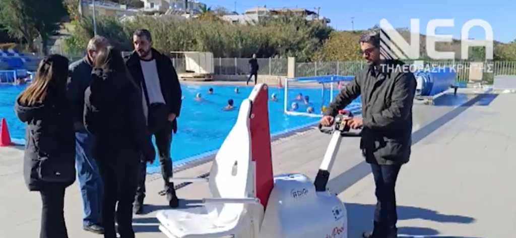 Παρουσιάστηκε σήμερα, στο Δημοτικό Κολυμβητήριο Κλαδισού το νέο σύστημα εξυπηρέτησης ΑμεΑ, το οποίο ενισχύει ουσιαστικά την προσβασιμότητα των αθλητικών εγκαταστάσεων του Δήμου Χανίων.Ο κινητός τροχήλατος γερανός πισίνας, πρωτοποριακής τεχνολογίας αποτελεί δωρεά της οικογένειας Λάμπρου Κωνσταντουδάκη – Κατάκη, εις μνήμην της Τώνιας Κατάκη, και έρχεται να συμπληρώσει τις παρεμβάσεις, που έχουν ήδη υλοποιηθεί στο Κολυμβητήριο Κλαδισού διαμορφώνοντας ένα περιβάλλον φιλικό και λειτουργικό για τα άτομα με αναπηρία.