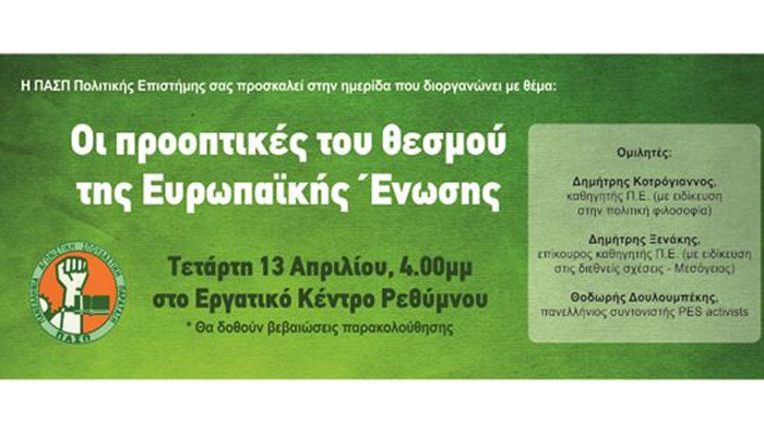 Η ημερίδα πρόκειται να πραγματοποιηθεί στο Εργατικό Κέντρο Ρεθύμνου (Πλατεία Εργατικής Πρωτομαγιάς) , την Τετάρτη 13/4/16 και ώρα 16.00