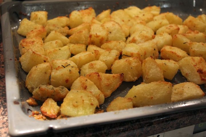 Ψήνετε για 30 λεπτά περίπου, γυρίζοντας στον μισό χρόνο τις πατάτες, μέχρι να κάνουν τραγανή κρούστα και να πάρουν ένα τέλειο χρυσό χρώμα.