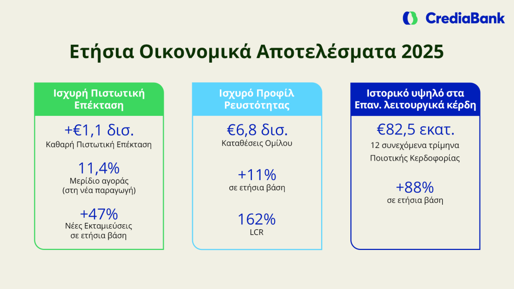 Κλείνοντας το 2025 με €1,1 δις. καθαρή πιστωτική επέκταση, €82,5 εκατ. επαν. λειτουργικά κέρδη, €57,8 εκατ. επαναλαμβανόμενα κέρδη προ φόρων και επιχειρηματικές εξελίξεις η CrediaBank εδραιώνεται πλέον στο τραπεζικό σύστημα
