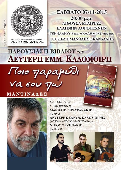Ο Σύλλογος Ανωγειανών της Αθήνας «Το Ιδαίον Άντρον» σας προσκαλεί στην παρουσίαση του βιβλίου του Ανωγειανού μαντιναδολόγου και χοροδιδάσκαλου Λευτέρη Εμμ. Καλομοίρη, με τίτλο «Ποιο παραμύθι να σου πω» (Μαντινάδες), που θα πραγματτοιηθεί το Σάββατο, 07 Νοεμβρίου 2015, ώρα 20:00 μ.μ., στην Αίθουσα της Εταιρίας Ελλήνων Λογοτεχνών (Γενναδίου αριθμ. 8 και Ακαδημίας, 6ος όροφος).