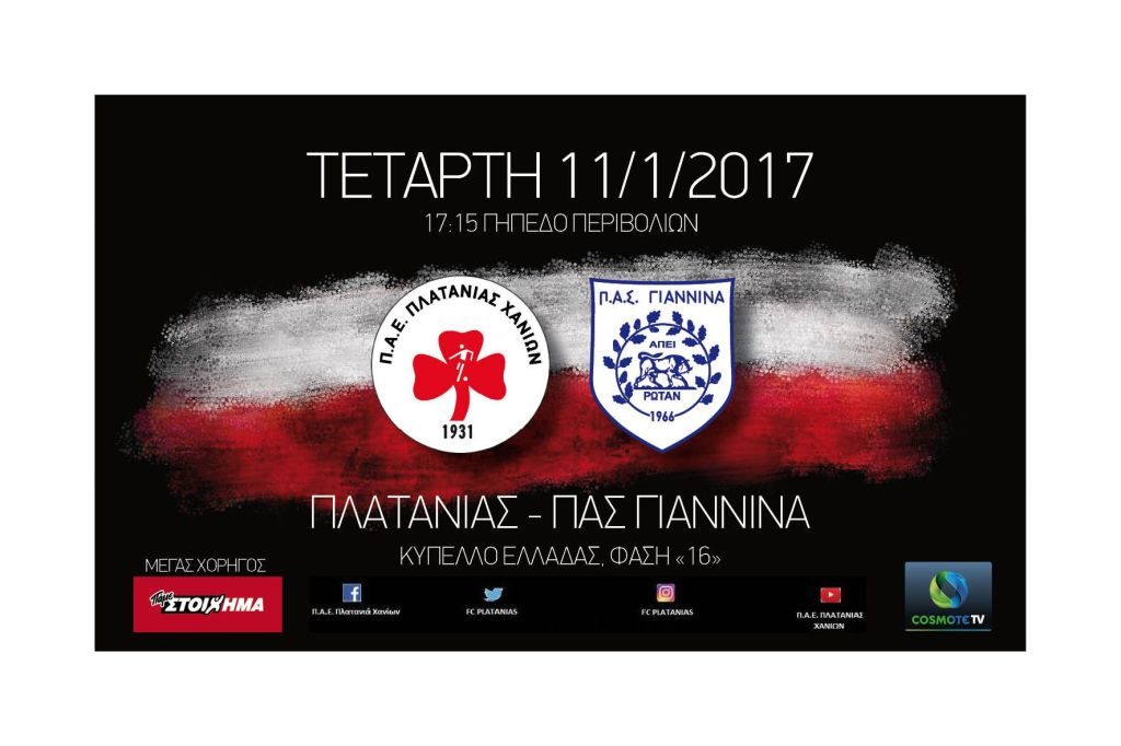 Ολοκληρώθηκε η προετοιμασία της ομάδας για την αυριανή ( 11/1/17, 17:15) αναμέτρηση με τον ΠΑΣ Γιάννινα για την 3η φάση (16) του Κυπέλλου Ελλάδας. Μετά το τέλος της προπόνησης ο τεχνικός του Πλατανιά, Γιώργος Παράσχος, ανακοίνωσε την αποστολή που αποτελείται από 19 παίκτες. Συγκεκριμένα είναι οι:
