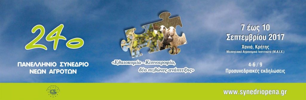 Σας προσκαλούμε στην τελετή έναρξης καθώς επίσης και στις εργασίες του 24ου Συνεδρίου της Πανελλήνιας Ένωσης Νέων Αγροτών. Το συνέδριο θα πραγματοποιηθεί στους χώρους του Μεσογειακού Ινστιτούτου Χανίων (Μ.Α.Ι.Χ.) από τις 7 έως τις 10 Σεπτεμβρίου 2017 με θέμα «Ελαιοκομία – Προβατοτροφία, Δύο Πυλώνες Ανάπτυξης».