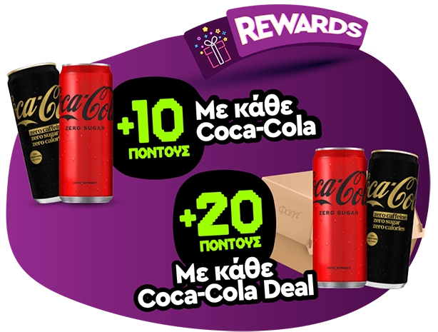 Για κάθε Coca-Cola κερδίζεις επιπλέον 10 πόντους, ενώ για κάθε Coca-Cola Dealκερδίζεις επιπλέον 20 πόντους, οι οποίοι προστίθενται στο σύνολο των πόντων της παραγγελίας σου