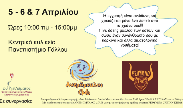 Η Φοιτητική Ομάδα Προώθησης Εθελοντικής Αιμοδοσίας ?Φυλή εξ Αίματος? του Πανεπιστημίου Κρήτης σε συνεργασία με το Συνεργαζόμενο Κέντρο του Συλλόγου Όραμα Ελπίδας, «Aνεμόμυαλοι Club» και με την υποστήριξη της ΚΑΕ Ρέθυμνο Cretan Kings, σας προσκαλούν σε κοινή δράση και ενημέρωση για την ευαισθητοποίηση και αύξηση εθελοντών δοτών μυελού των οστών. Η κοινή μας δράση όπως έχει αποδειχθεί και στο παρελθόν έχει κατορθώσει να αυξήσει σημαντικά το ποσοστό αιμοδοτών και μαζί μπορούμε να αυξήσουμε τους δότες μυελού των οστών.