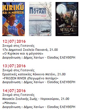Την Τρίτη 12 Ιουλίου ξεκινάει η δράση «Σινεμά στις Γειτονιές» από τον Δήμο Χανίων, με δωρεάν προβολές ταινιών ελληνικού και ξένου κινηματογράφου για μικρούς και μεγάλους. Συγκεκριμένα προβάλλεται η ταινία «Ο Κιρίκου και η μάγισσα» στο 17ο Δημοτικό Σχολείο Παχιανών. Ώρα έναρξης προβολής:21.00.