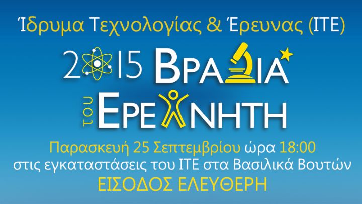Την Παρασκευή, 25 Σεπτεμβρίου 2015, από τις 18:00, στις εγκαταστάσεις του Ιδρύματος Τεχνολογίας και Έρευνας θα πραγματοποιηθεί η «Βραδιά Ερευνητή», ένας θεσμός που ξεκίνησε το 2005 με την υποστήριξη της Ευρωπαϊκής Επιτροπής, ο οποίος με τη φετινή εκδήλωση συμπληρώνει δέκα χρόνια επιτυχημένων εκδηλώσεων. Η δράση αυτή στοχεύει στο να γνωρίσει το ευρύ κοινό και ιδιαίτερα οι νέοι, τους ερευνητές και να συνομιλήσουν μαζί τους για την επιστημονική και κοινωνική σπουδαιότητα του έργου που επιτελούν.