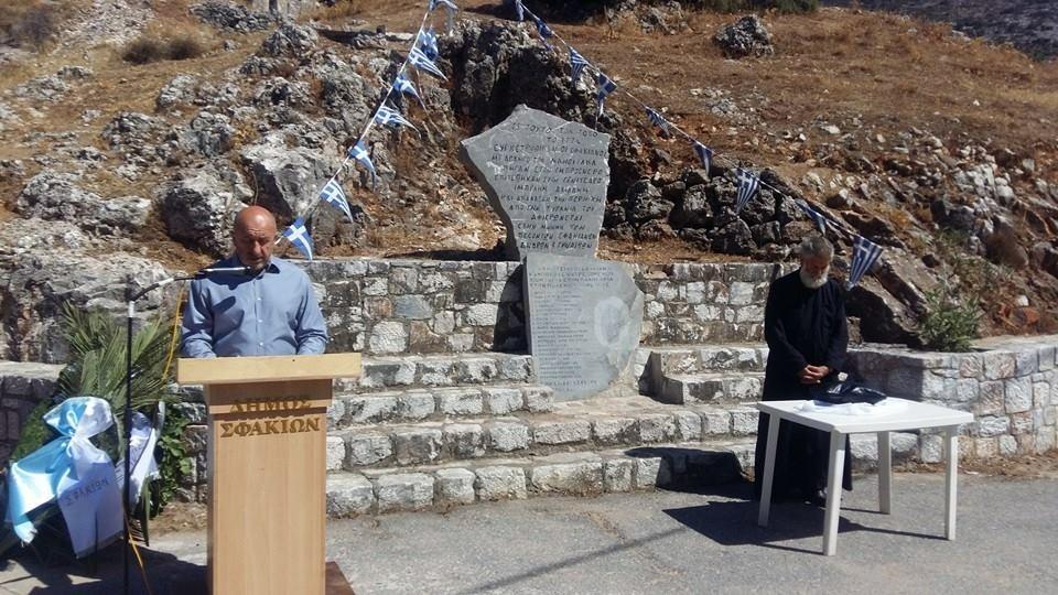 Ακολούθησε χαιρετισμός από τον Δήμαρχο Σφακίων κ. Ζερβό και ομιλία από τον κ. Παπαδόσηφο Ιωάννη ,δάκαλο και πρώην πρόεδρο της Ένωσης Σφακιανών Ν. Χανίων για να συνεχιστεί η εκδήλωση με καταθέσεις στεφάνων στο μνημείο των πεσόντων και παράθεση φιλοξενίας από το Δήμο Σφακίων σε τοπικό κατάστημα.