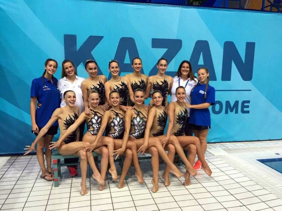 Η ελληνική ομάδα αποτελούμενη από τις Μαρία Ελένη Αρμάου, Ιφιγένεια Δίπλα, Βαλεντίνα Φαραντούρη, Βασιλική Κοφίδη, Όλγα Κουργιαντάκη, Σοφία Eυαγγελία Μαλκογεώργου, Αναστασία Ταξοπούλου, Άννα Μαρία Ταξοπούλου, Δήμητρα Τσιαντή, Αθανασία Τσόλα, αναπλ. Θάλεια Παπαδοπούλου, Όλγα Παπασαράντη, εκτέλεσε ένα εξαιρετικό και μεγάλης δυσκολίας πρόγραμμα και βαθμολογήθηκε με 85,6666 βαθμούς καταλαμβάνοντας την τιμητική 6η θέση στο Παγκόσμιο πρωτάθλημα που ολοκληρώθηκε το Καζάν της Ρωσίας. Πρόκειται για μια μοναδική επιτυχία που πιστοποιεί την συνεχιζόμενη άνοδο που παρουσιάζει το άθλημα στην Ελλάδα τα τελευταία χρόνια ενώ δημιουργεί ακόμα πιο μεγάλες προσδοκίες για το μέλλον.