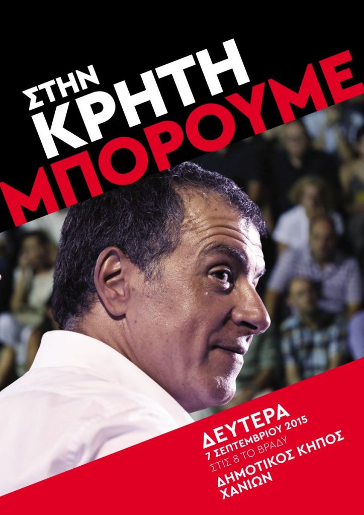 ΧανιαΣυγκέντρωση “Το Ποτάμι” στον Κήπο στα Χανιά 3 Σεπ 2015 07.51Ο επικεφαλής του Ποταμιού Σταύρος Θεοδωράκης, θα μιλήσει σε ανοιχτή συγκέντρωση στον Δημοτικό Κήπο Χανίων τη Δευτέρα 7 Σεπτεμβρίου στις 8 μ.μ. Grigorios Koukoudakis SHARE |