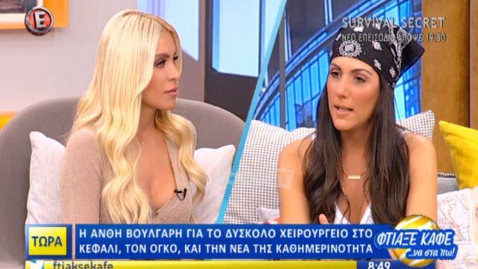 "Είδα μια μορφή, είδα έναν νέο άνθρωπο, έλαμπε το πρόσωπό του, και κατάλαβα ότι ήταν ο…"Η Ανθή Βούλγαρη επέστρεψε το πρωί της Τετάρτης στην εκπομπή Φτιάξε καφέ να στα πω. Η Κατερίνα Καινούργιου την υποδέχτηκε με μια ζεστή αγκαλιά και πολλά χαμόγελα. Η δημοσιογράφος συγκλόνισε με την εξομολόγησή της για τη δύσκολη επέμβαση στην οποία υποβλήθηκε αλλά και για το θαύμα που βίωσε.