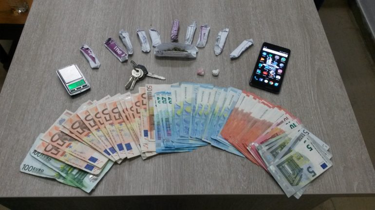 Κατά τη διάρκεια του ελέγχου βρέθηκαν στην κατοχή του και κατασχέθηκαν οχτώ ισάριθμες αυτοσχέδιες συσκευασίες οι οποίες περιείχαν συνολικά 12 γραμμάρια κάνναβης, δύο συσκευασίες με μικροποσότητα κοκαΐνης, και κινητό τηλέφωνο.