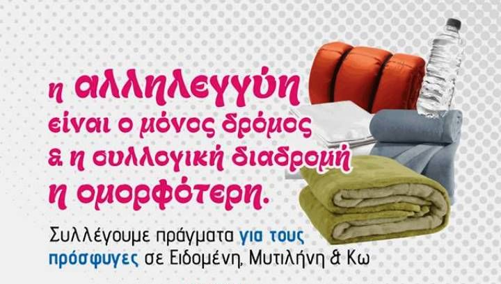 Μέχρι την Τετάρτη 30 Σεπτεμβρίου και ώρες 19:00 ? 22:00, εκτός Σαββάτου και Κυριακής, στην πίσω αυλή του Πολύκεντρου Νεολαίας του Δήμου Ηρακλείου, στην οδό Ανδρόγεω, δίπλα στο Κ.Ε.Π., πίσω από τη Βασιλική του Αγίου Μάρκου, συγκεντρώνουμε και πάλι είδη ανάγκης για τους πρόσφυγες σε Ειδομένη, Μυτιλήνη και Κω.