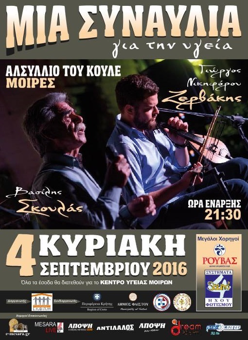 Συναυλία για κοινωνικό σκοπό με τον Βασίλη Σκουλά και τον Γιώργο Νικηφόρου Ζερβάκη πραγματοποιείται την Κυριακή 4 Σεπτεμβρίου στις 9:30 το βράδυ στις Μοίρες στο αλσύλλιο του Κούλε. Η εκδήλωση διοργανώνεται από την Επιτροπή Υγείας Φορέων-Πολιτών της Μεσσαράς (για το Κέντρο Υγείας Μοιρών) σε συνεργασία με την Περιφέρεια Κρήτης, το Δήμο Φαιστού το Σύλλογο Φίλων του Κέντρου Υγείας Μοιρών και τον Παγκρήτιο Λαογραφικό Σύλλογο ‘’ Κρήτη & Υγεία. Σύμφωνα με τους οργανωτές τα έσοδα της συναυλίας θα διατεθούν για τις ανάγκες του κέντρου υγείας Μοιρών