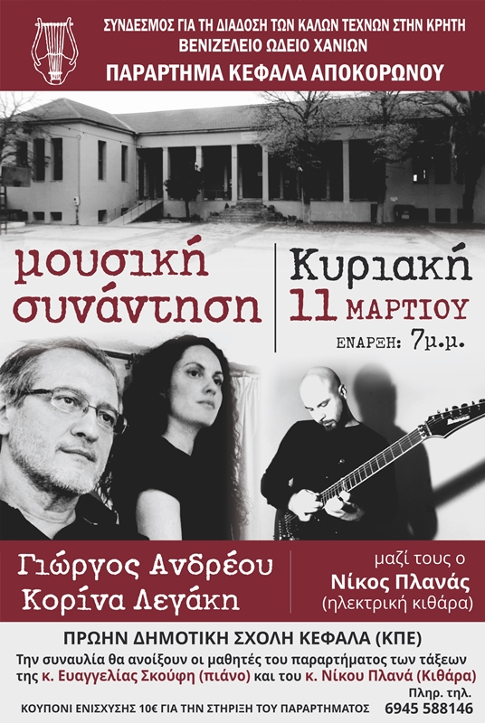 Την Κυριακή λοιπόν, στις 11 Μαρτίου και ώρα 7μ.μ. διοργανώνεται στην αίθουσα διαλέξεων της πρώην Δημοτικής Σχολής Κεφαλά συναυλία με έναν από τους σημαντικότερους μουσικοσυνθέτες τραγουδοποιούς και στιχουργούς της γενιάς του τον Γιώργο Ανδρέου και με μία από τις αξιολογότερες σύγχρονες φωνές την Κορίνα Λεγάκη. Μαζί τους θα "συνομιλήσει" σε συνθέσεις του Γιώργου Ανδρέου και όχι μόνο, ο ταλαντούχος νεώτερης γενιάς καθηγητής του Βενιζελείου Ωδείου και του παραρτήματος Κεφαλά Νίκος Πλανάς.