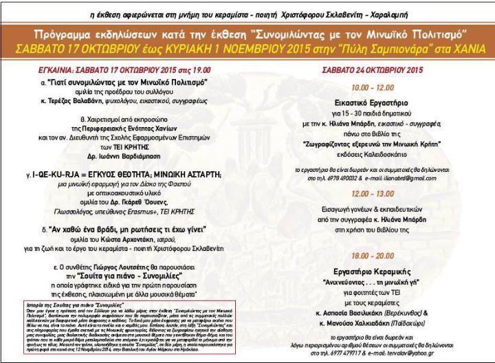 Δηλώσεις συμμετοχής των παιδιών λόγω περιορισμού των θέσεων στο τηλ. 6978-490032. Στις 18.00-20.00 οι κεραμίστες Ασπασία Βασιλικάκη (Βερέκυνθος) και Μανούσος Χαλκιαδάκης (Παϊδοχώρι) διοργανώνουν το εισαγωγικό εργαστήριο κεραμικής “Ανιχνεύοντας…τη μινωική γη” για τους φοιτητές των ΤΕΙ, κρατήσεις θέσεων στο τηλ. 6977-479717. Η έκθεση θα παραμείνει ανοιχτή από Σάββατο 17.10. στις 18.00 έως Κυριακή 1.11.2015 στις 13.00. Οι ώρες λειτουργίας θα είναι καθημερινά 10.00-13.00 και 18.00-22.00.