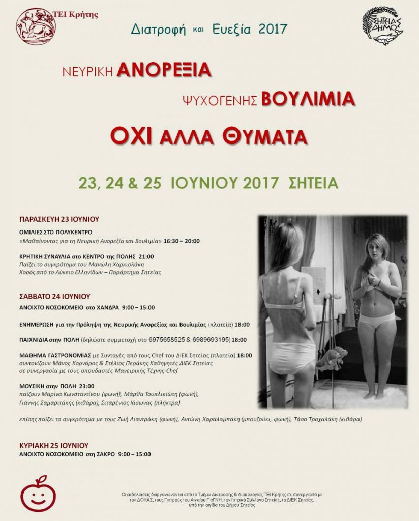 Οι εκδηλώσεις ξεκινούν την Παρασκευή 23 Ιουνίου, και ώρα 16.30 το απόγευμα, στο Πολύκεντρο του Δήμου Σητείας, με ενημερωτική ημερίδα ανοιχτή για το κοινό, με θέμα: «Μαθαίνοντας για τη Νευρική Ανορεξία και Βουλιμία».